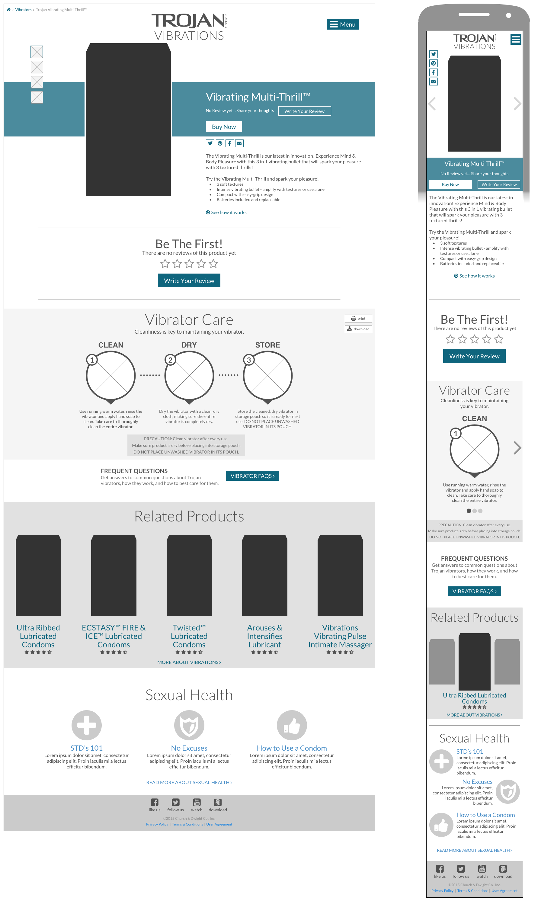 The Trojan site redesign required that we rethink how separate but related product categories live together. Trojan Condoms, Lubricants and Vibrations each had their own URLs and websites, but the client wanted to combine the three properties, creating a cohesive consumer experience, while retaining the distinct brand image of each. The result is a unique homepage that acts as a full-page carousel that rotates all content -- when the user scrolls the carousel locks to the current tab and allows the user to explore. The result is a striking visual site that targets younger audiences with it's bold styles and cutting edge interaction model. Each of the three subcategories has it's own content that is integrated with shared sexual health and sexual exploration content.